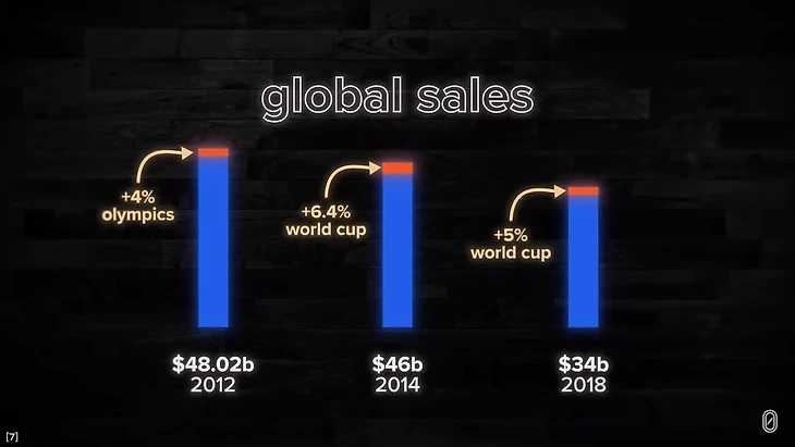 Цифры говорят сами за себя. Согласно их собственным финансовым отчетам, в период проведения Олимпийских игр или Чемпионата мира по футболу глобальные продажи увеличиваются примерно на 5% - это средний рост продаж около 600 миллионов долларов за одно мероприятие. Стоит учесть тот факт, что «Coca-Cola» платит FIFA около 100 миллионов долларов за каждый Чемпионат мира.