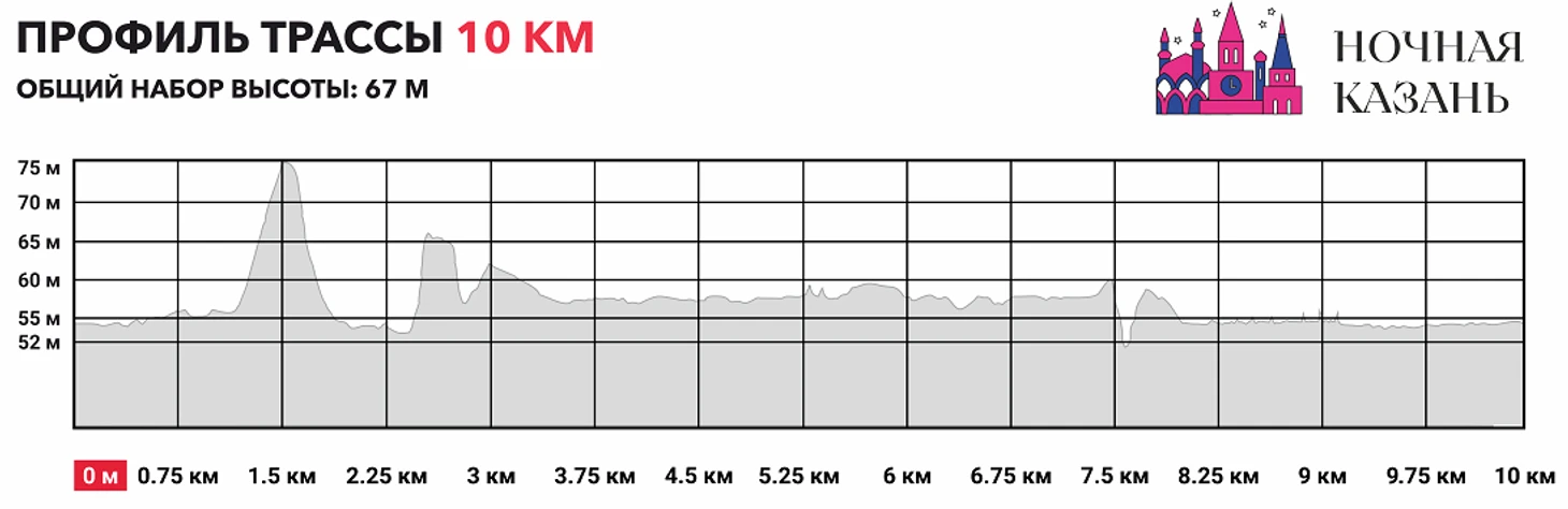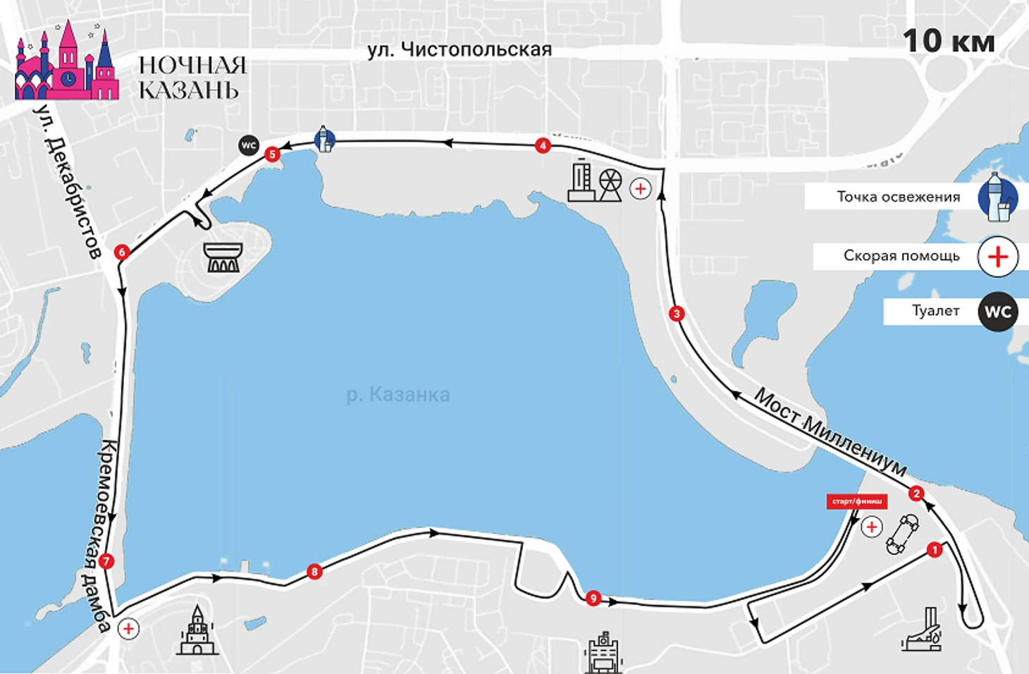 Трасса забега на 10 км обычно пролегает по Кремлевской набережной, мосту Миллениум, улице Сибгага Хакима и Кремлевской дамбе, и на протяжении почти всей дистанции участникам открывается живописный вид на реку Казанку. Детские забеги и забег на 5 км проходят на Кремлевской набережной.