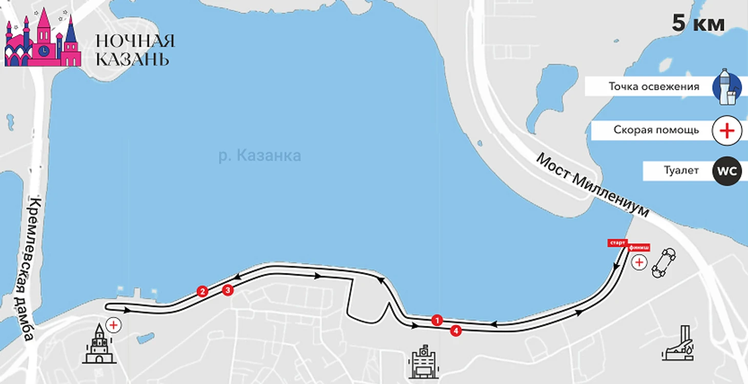 В прошлом году стартово-финишный городок располагался на Кремлевской набережной рядом с экстрим-парком «УРАМ», а трасса забега на 5 км выглядела следующим образом: