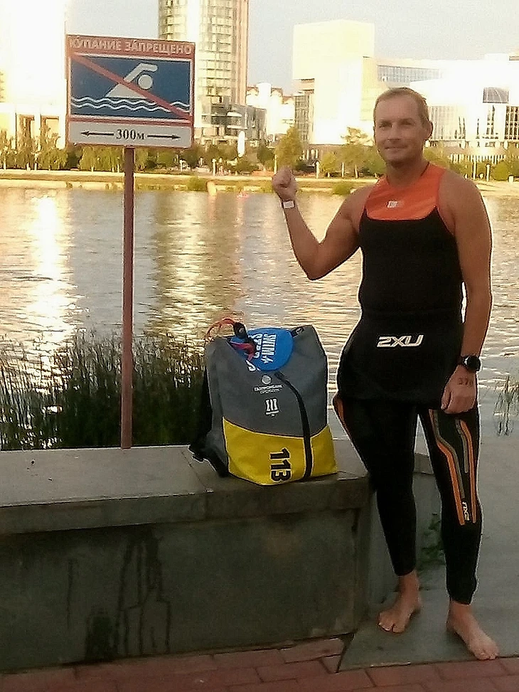 Про воду мне особо нечего рассказывать. Я знаю свой темп, знаю стратегию и тактику на дистанции и еще я знаю, что в воде умею полностью отключать сознание. Из опций остается только зрение, что бы намечать ориентиры и техничная работа. Уходят все мысли, страхи, опасения, мне безразличны погодные условия, состояние воды, контактная борьба. Для рыбы в которую я временно трасфигурируюсь, все это не имеет значения. Первые тридцать метров и нужно поворачивать вправо, я обычно не лезу в «суп» и иду чуть левее или правее от «пачки», поднимаю голову и понимаю, что вместо дистанции сделал десяток гребков в сторону противоположного берега, ориентируюсь, концентрируюсь и полетели. Плавание прям огонь, все 38 минут меня не покидает ощущение полета, в этом полете мимо меня проносятся десятки пловцов и остаются позади… все - 2000 метров заканчиваются, с чувством легкой грусти я покидаю реку Исеть. Плавание в пределах ожидаемой готовности, но время на минуту хуже, чем в Питере.