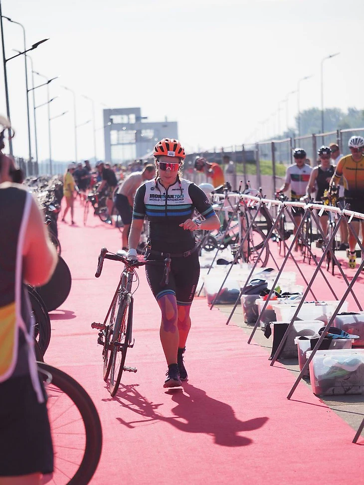 Первые метров 300 никак не могла надышаться, жутко спирало дыхание, но потом потихоньку вкатилась) Нужно было оплыть 6 буев и развернуться на финиш. Расстояние от буя до буя так медленно сокращалось, а люди в воде постоянно толкались и пинались, что хотелось побыстрее закончить этот этап, а на финише 2е меня постоянно зажимали, ощущение было, что мы как кильки в бочке. Ближе к середине дистанции я вошла в свой темп и кажется поймала ощущение медитации. Потому что больше ничего не оставалось, как уверенно двигаться к транзитной зоне, ведь где-то там меня ждет следующий этап, велосипедный.