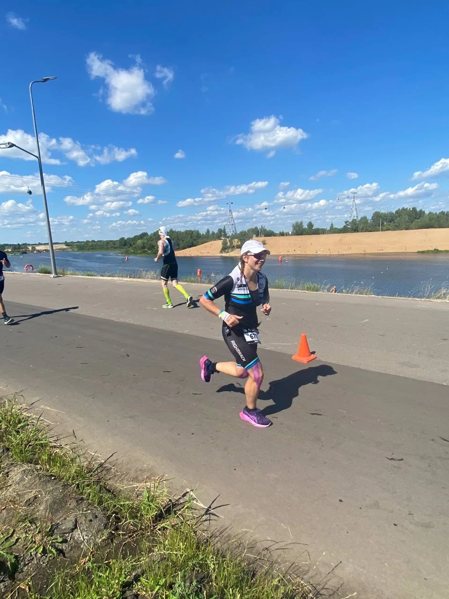 На втором я поняла все «прелести» этого этапа. В одну сторону жуткий ветер, против которого просто стоишь, а в другую стараешься накатить всё то, что потеряла по скорости. На каждом круге был пункт питания, поэтому гелями и изотоником я старалась знатно закидываться, ведь впереди ещё крутить и крутить… Всего на велоэтапе было 8 подъемов в мост, они знатно подъедали силы, а спуски с них были достаточно скоростные(скорость можно было набрать до 40-50 и больше км/ч), поэтому приходилось тормозить, чтобы не разложиться в какой-нибудь столб при повороте… Как говорит мой друг: шлем вам нужен не для выживания, а чтобы мозги с асфальта быстрее было собрать. Поэтому приходилось быть аккуратной на спусках.