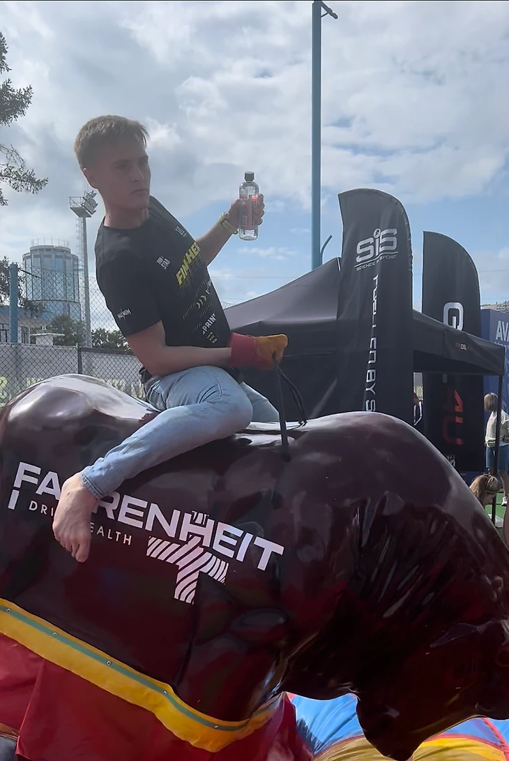 На экспо был еще один конкурс – усидеть на пластиковом быке как можно дольше. Решил и тут испытать удачу. Снимаю кофту и ботинки, залезаю на быка и… слышу опять свое имя на сцене? Я выиграл спецприз за самые быстрые транзитки.