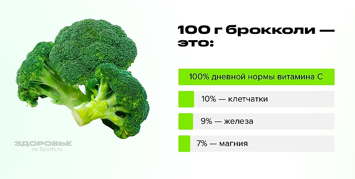 Брокколи богата питательными веществами, включая витамин С, К, А, калий, натрий, цинк. Пара соцветий брокколи на обед – и дневная норма по основным витаминам и минералам выполнена.