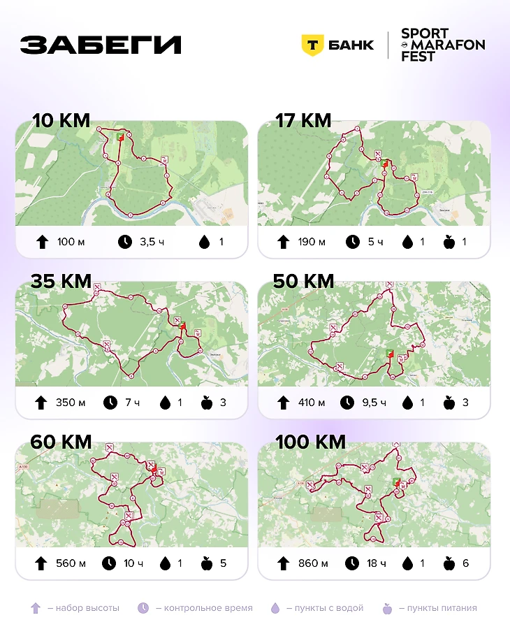Треки забегов проложены по лесным тропам, грунтовым дорогам, полям, на которых можно встретить броды, а также лужи и грязь, если будет дождливая погода.