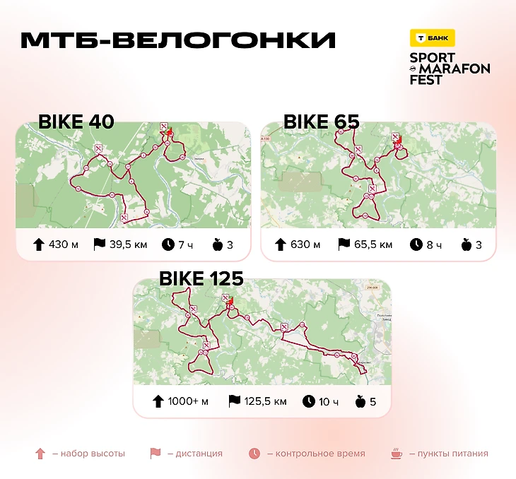 BIKE 125. Маршрут захватывает всю территорию парка «Угра» и «Никола-Ленивец». На дистанции ждут тех, кто уверен в своих силах и готов к приключениям и трудностям. Набор высоты более 1000 метров, асфальтовые участки почти отсутствуют, много сложных подъемов и спусков.