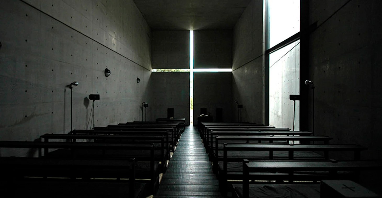 «Да, я бы сказал, что это церковь Света в Ибараки (да, его фотографии находятся в самом начале поста — авт.), построенная в 1989 году. Это простой необлицованный бетонный бокс прямоугольной формы, шесть метров в длину и восемнадцать в ширину. Бюджет был ограничен, поэтому мы экономили на отделке. Получилось пространство из голого, необлицованного бетона, в которое свет поступает через крестообразную щель в передней стене. Степень освещенности меняется в зависимости от сезона и времени суток, и благодаря естественному освещению все пространство приобретает вид святилища».