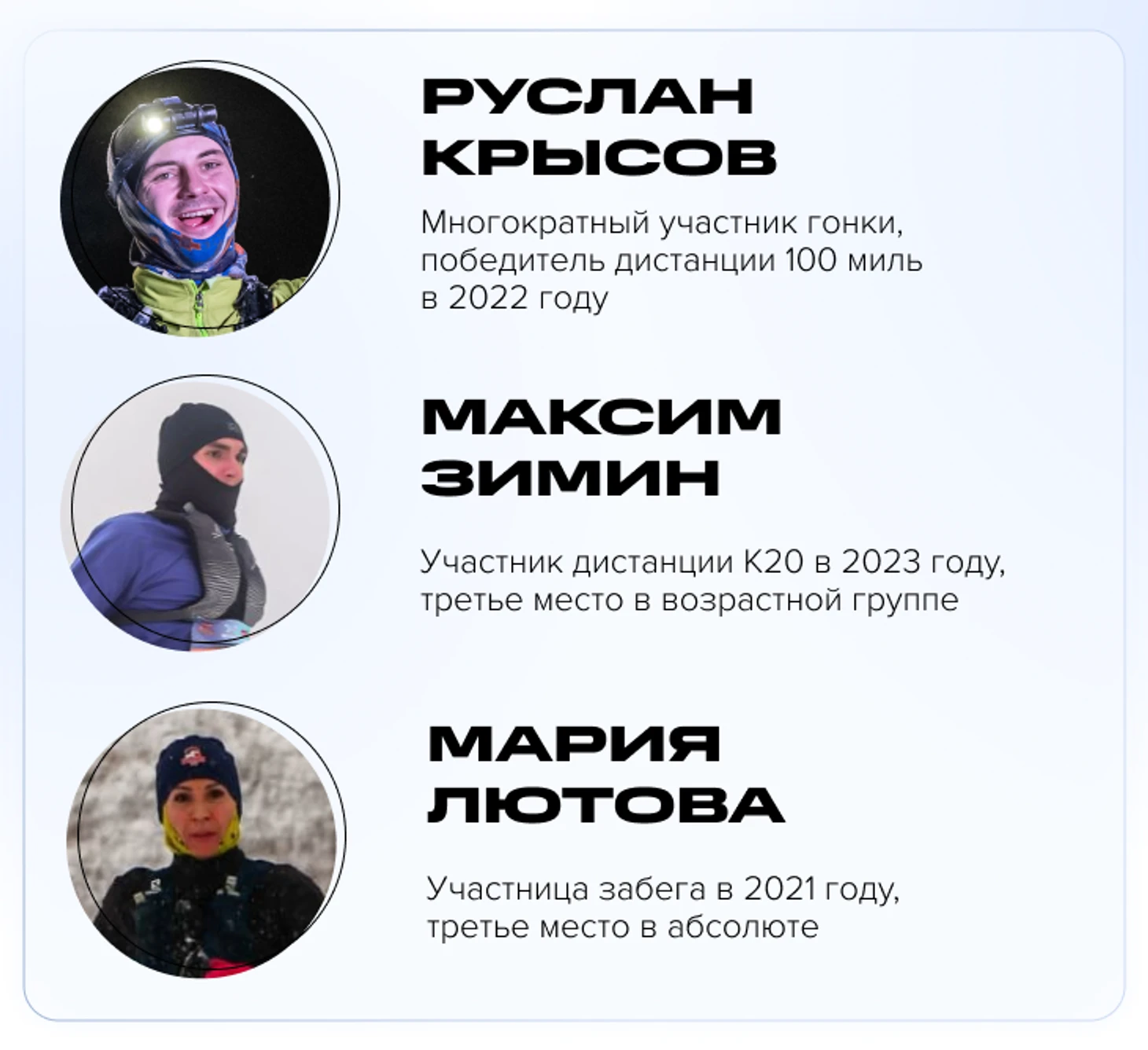 Руслан Крысов, участник забега на 100 миль: «Чем выше сугробы, тем сложнее трасса и ниже скорость передвижения по ней. На каждом ПП установлен лимит прохождения, после которого атлет не имеет права продолжать движение – сделано это в целях безопасности участников. На первой половине дистанции 100 миль временные лимиты установлены довольно жестко, а дальше уже более комфортно. Поэтому самая трудная задача – уложиться в контрольное время на первой заброске (48,5 км), а дальше уже по асфальту скорость добирается. Мой совет – организовывайтесь в группы для совместной тропежки до первой заброски, сменяя друг друга от ПП до ПП.