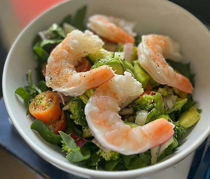 Нарежьте авокадо кубиками, а помидоры черри пополам. В миске смешайте листья салата, авокадо, помидоры и креветки. Заправьте оливковым маслом и лимонным соком, посолите и поперчите. Аккуратно перемешайте и подавайте.