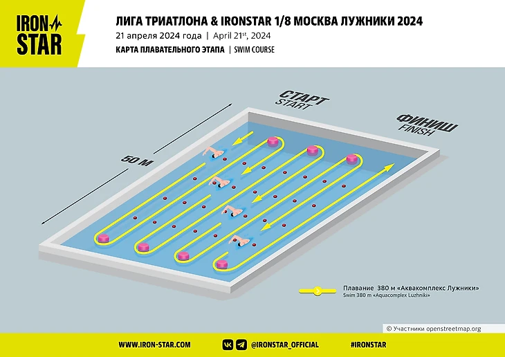 Обычно любой триатлон включает в себя водный этап на открытой воде, но, как вы понимаете, в апреле мало, где еще можно это сделать, поэтому водный этап проходил в бассейне. Благо Аквакомплекс «Лужники» позволяет все это сделать там. Трасса просто космическая, не думаю, что многие плавали так.