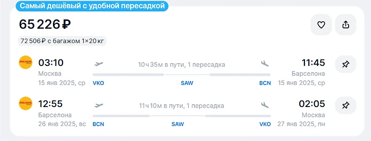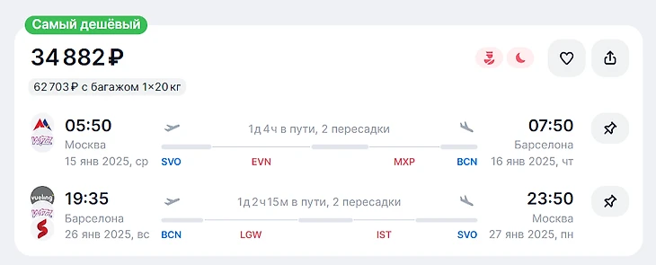 Например, самый дешевый вариант, при котором 2 пересадки в ту сторону: в Ереване и Милане, а в обратную: в Стамбуле и Лондоне, будет стоить около 35 тыс. руб. Все цены показаны на середину января 2025 года.