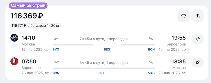 В самом быстром варианте, который проходит через Стамбул (обратно) и через Белград (туда), цена достигает 116 тыс. руб. Но зато путь займет около 7-8 часов.