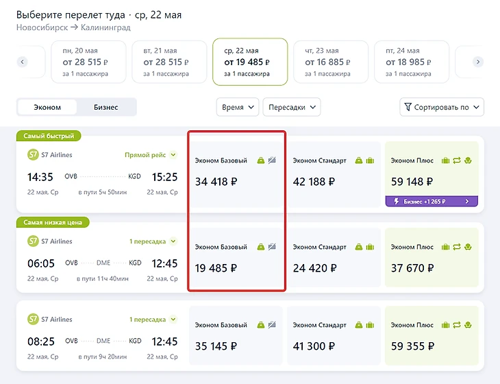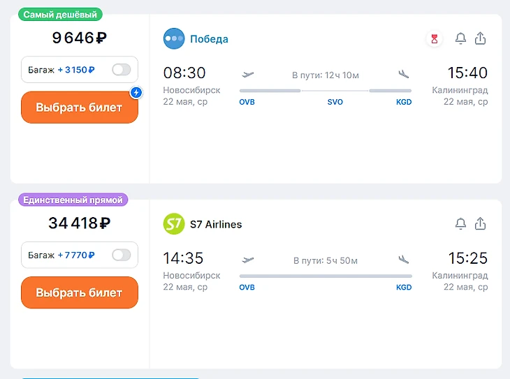 Из Новосибирска лететь в Калининград 5 часов 50 минут. Рейсы выполняет авиакомпания S7 Airlines. В сезон стоимость билета составляет 35 000 рублей. Если лететь с пересадками, то будет дешевле. На эти же даты продается билет с пересадкой до 20 000 рублей.