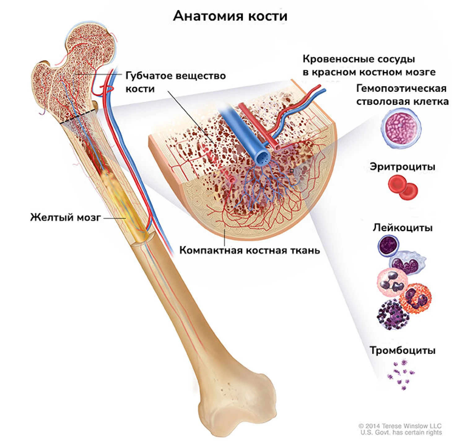 Костный мозг – это ткань, похожая на губку, из которой рождаются все клетки крови. Родоначальницами этих клеток выступают гемопоэтические стволовые клетки, которые в избытке содержатся внутри костной ткани. В зависимости от потребностей организма из них могут образовываться новые стволовые клетки; тромбоциты, которые останавливают кровотечения; эритроциты, доставляющие кислород ко всем органам и тканям; и лимфоциты – главные защитники организма от инфекций. Ежедневно костный мозг производит более 200 миллиардов новых клеток крови.