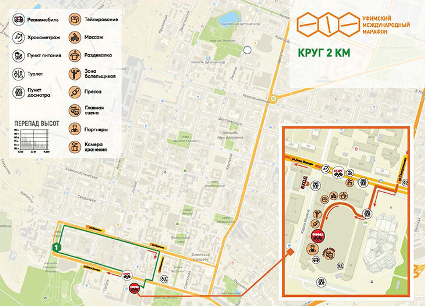 Участники дистанций 10 км, 21,1 км и 42,2 км стартуют на улице Заки Валиди возле стадиона «Динамо», бегут через парковку к памятнику Салавата Юлаева с видом на Конгресс-холл, разворачиваются обратно к скверу Гафури и бегут по улице Пушкина, где располагается первый пункт питания и медицинская помощь.