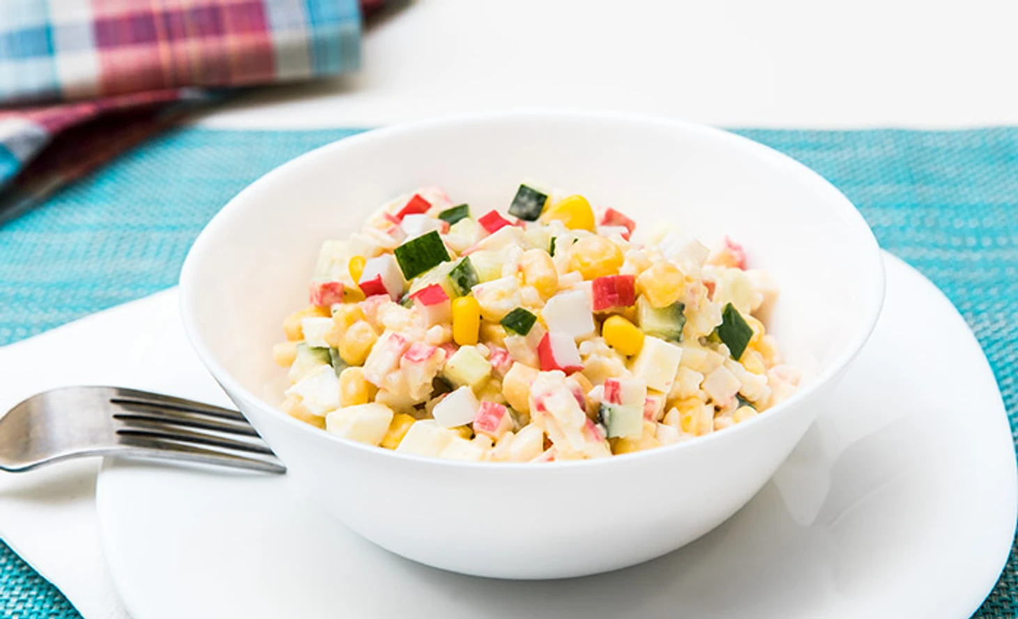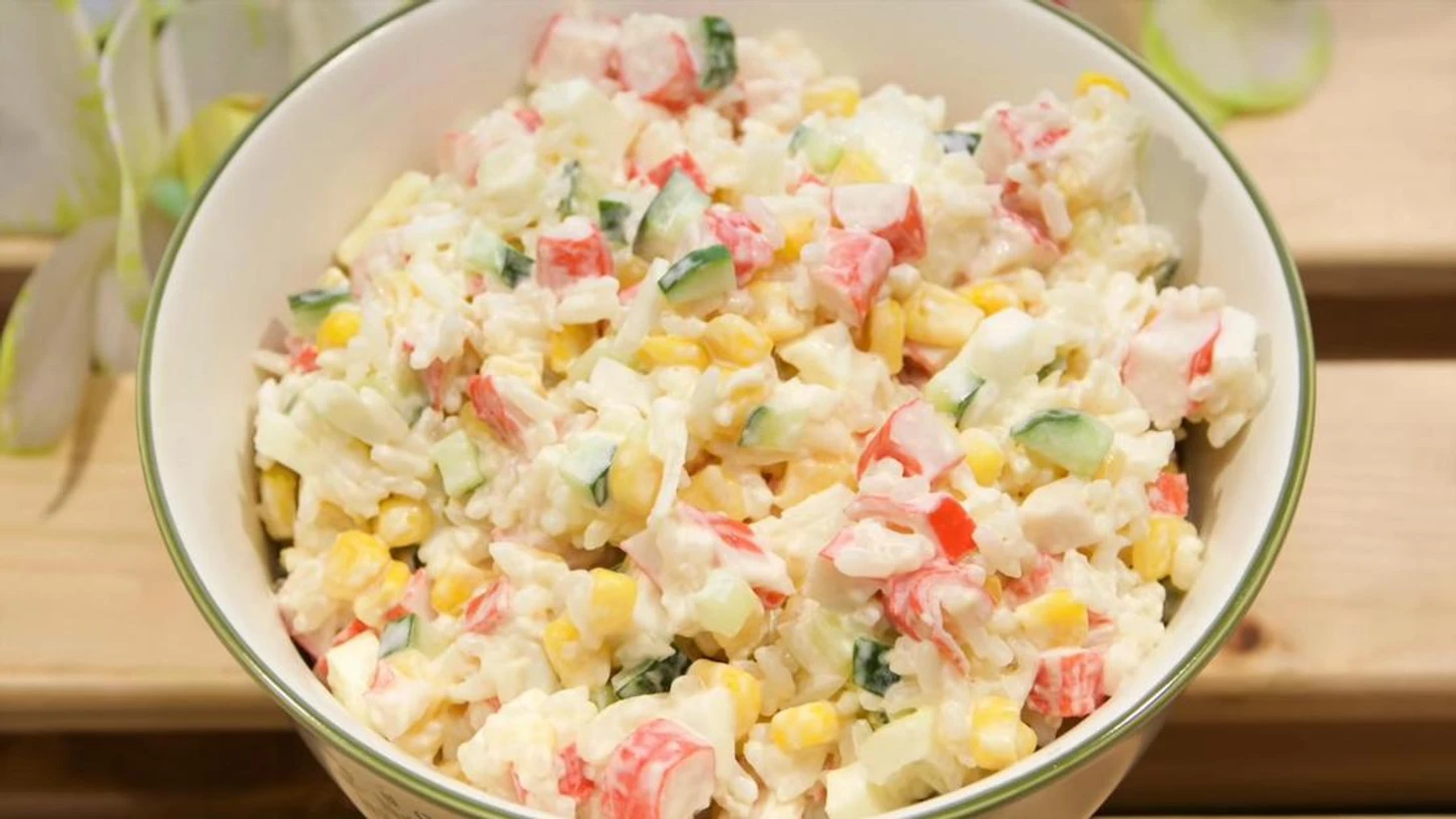 Питательный салат с крабовыми палочками, рисом, кукурузой, яйцами и сыром