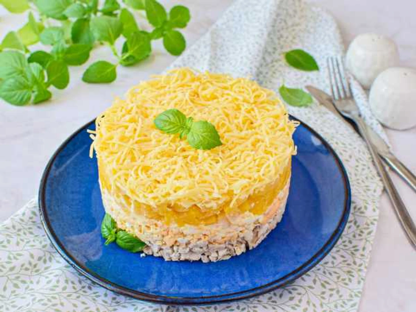 Этот салат идеально подходит для праздничного стола. Его вкусное сочетание курицы, ананаса и сыра никого не оставит равнодушным.