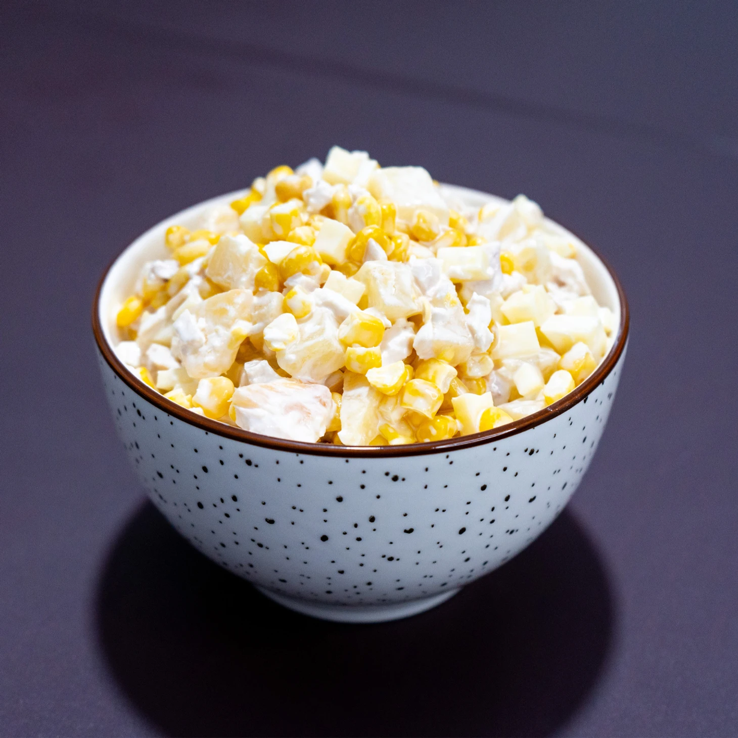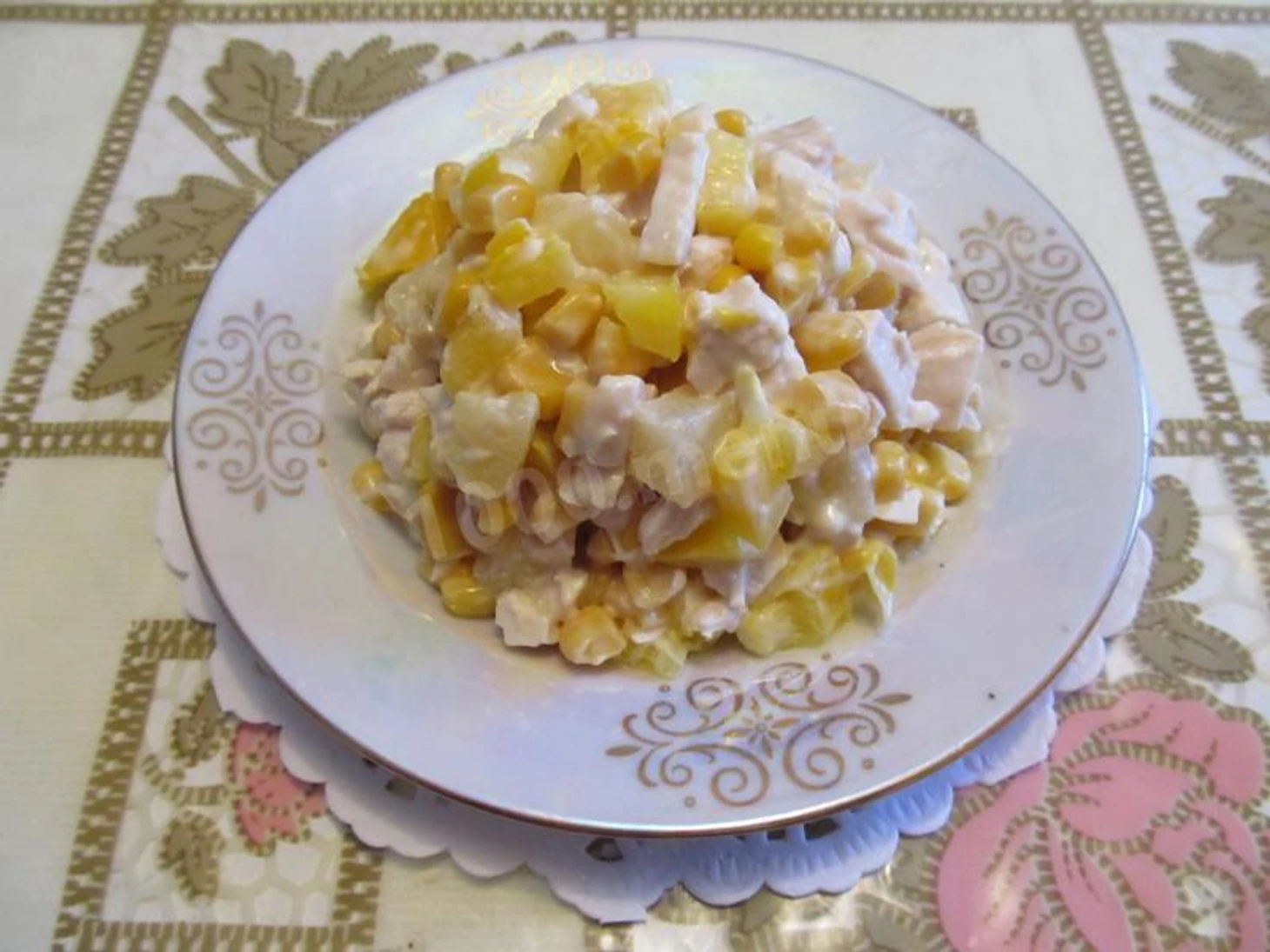 Сочетание копчёной курицы и ананаса придаёт этому салату изысканный вкус, а кукуруза и огурец добавляют свежести.