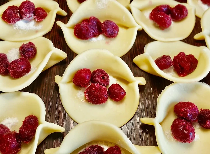 Готовое тесто делите на порционные куски. Каждый раскатываете скалкой до толщины примерно 2-3 мм. Из тонкого пласта необходимо вырезать ровные круги, можно использовать пиалу или другие предметы круглой формы. Процесс лепки вареников со свежей и замороженной вишней будет отличаться.