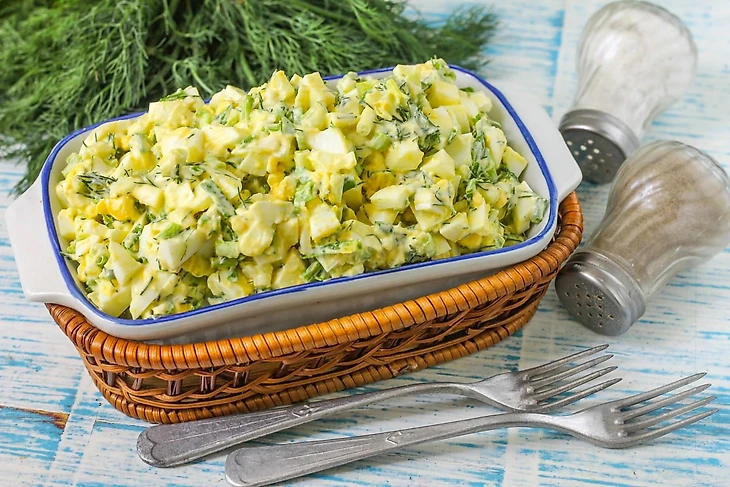 Это отличный салат, который украсит любое застолье. В состав входят: зеленый лук, яйца и сметана. Для начала необходимо сварить яйца вкрутую (3-4 штуки), а после остывания нарезать их мелким кубиком. К яйцам нужно добавить лук (достаточно одного пучка, но если вам нравится лук, то можно положить и больше). В качестве жидкого ингредиента используется сметана, но при желании ее можно заменить на майонез. По вкусу добавьте соль, перец и немного чеснока.