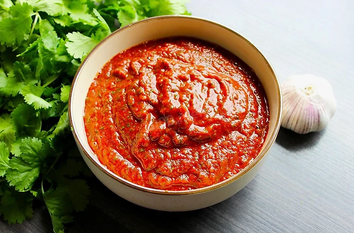 Далее в миске развести томатную пасту с водой и добавить в смесь специи из ступки. Соус необходимо перемешать до однородной массы и оставить на 2-3 часа.