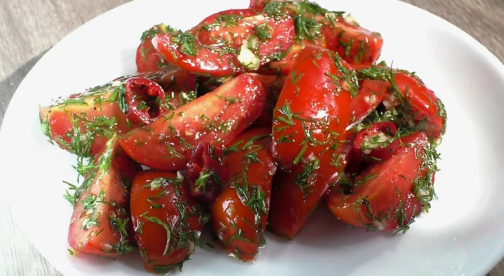 Для приготовления вкусных и ароматных помидоров понадобится несколько минут свободного времени и следующие ингредиенты: