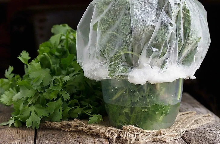 Для хранения зелени в воде необходимо проверить все листики и убрать пропавшие. Затем промыть кинзу и просушить на бумажном полотенце. Кончики травы подрезают и ставят в стакан или другую емкость с водой. Уровень воды до первых листьев, то есть скрыты только стебли. Сверху зелень можно прикрыть полиэтиленовым пакетом, чтобы не было лишнего контакта с воздухом. Воду необходимо менять каждые два-три дня.