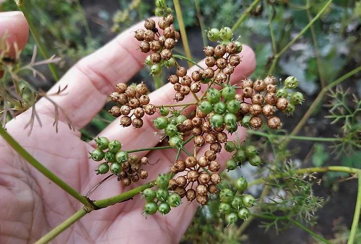 В открытом грунте зелень дает первые всходы в середине мая. Собирать урожай можно все лето. В начале осени завершается процесс цветения, и появляются головки с семенами. Сперва они зеленого цвета, потом начинают темнеть и высыхают. После этого кориандр можно заготавливать на зиму.