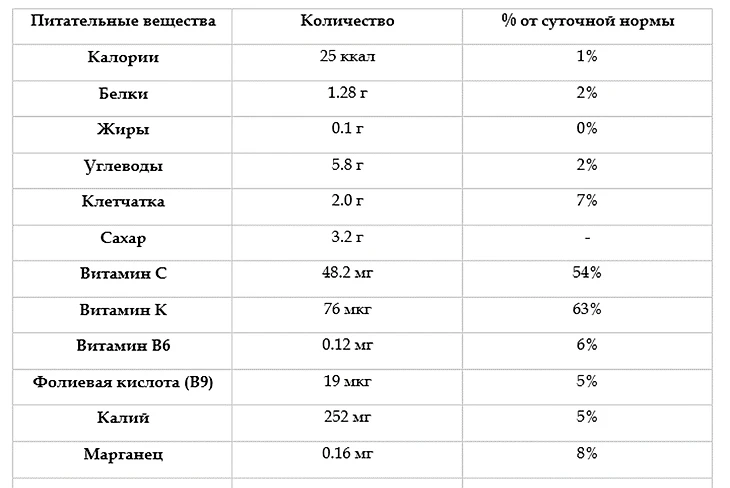 В 100 гр содержится всего около 25 ккал, что делает ее идеальным средством для контроля веса и диетического питания.