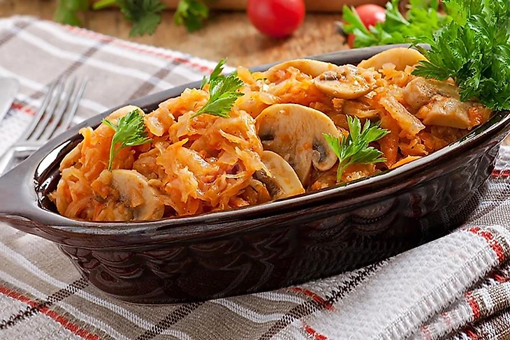 Куриное филе покрошить мелко, капусту нашинковать, грибы (любые) обычно режут слайсами или кубиками, лук и морковку можно потереть. В глубоком сотейнике нужно разогреть масло (лучше сливочное, но можно и растительное). Далее следует обжарить курицу, затем добавить в сотейник лук и морковь и пассеровать еще 5 минут. Всыпать оставшиеся овощи, перемешать, дождаться испарения жидкости, после тушить в закрытом виде 15-20 минут. В отдельной таре подготовить заправку – смешать сметану, муку, а также приправы. Залить соус к овощам, перемешать и готовить еще 5-7 минут.