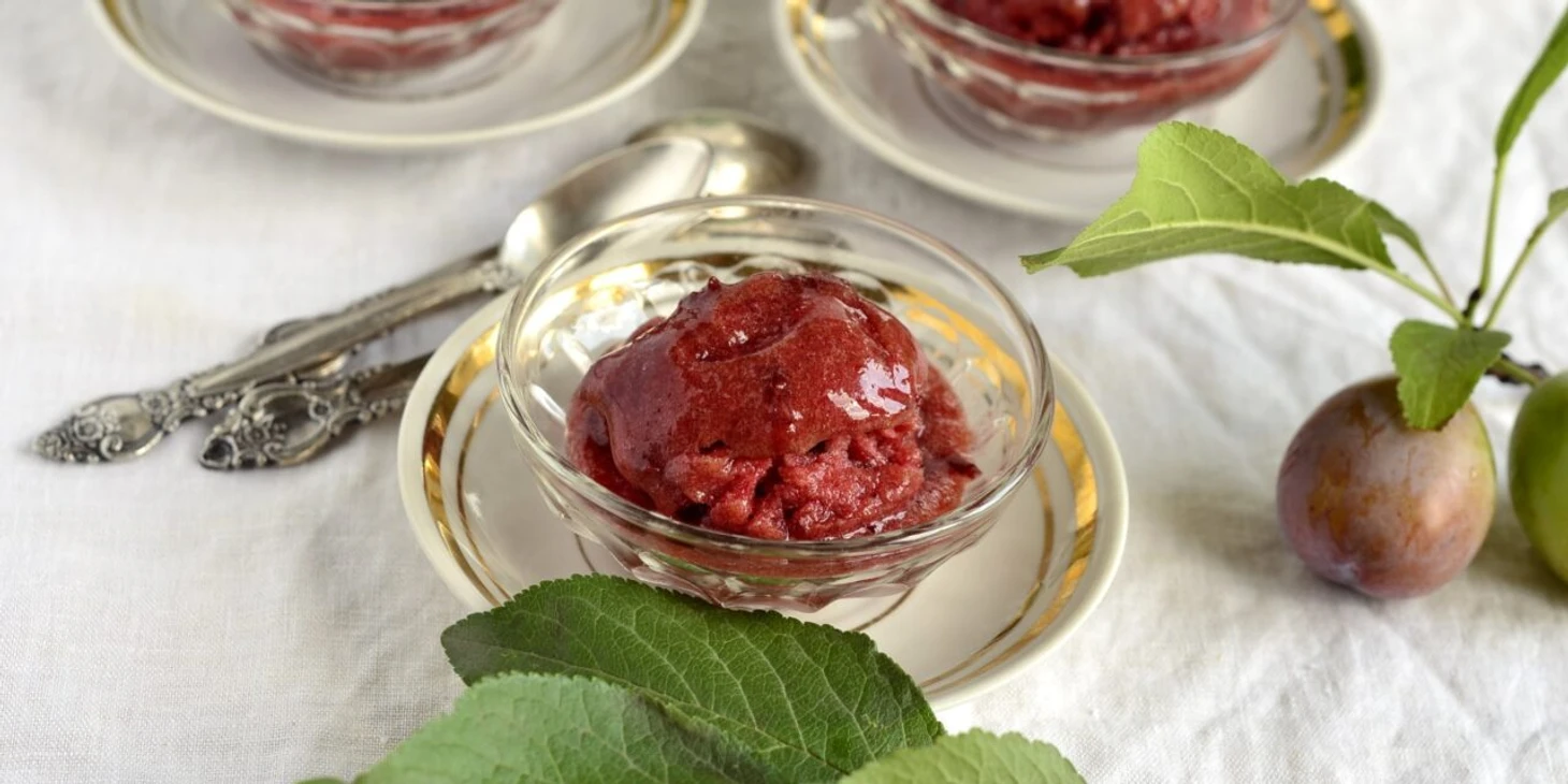 Для любителей освежающих десертов подойдет сливовый сорбет. Возьмите 500 г фрукта, промойте и удалите косточки. Сварите сироп из 200 г сахара и 200 мл воды, затем остудите его. Измельчите растение в блендере, добавьте сироп и 1 ст.л. лимонного сока. Перелейте смесь в контейнер и поместите в морозилку. Каждый час перемешивайте замерзающую массу вилкой. Через 4-5 часов сорбет будет готов. Подавайте этот легкий десерт, украсив листиками свежей мяты.