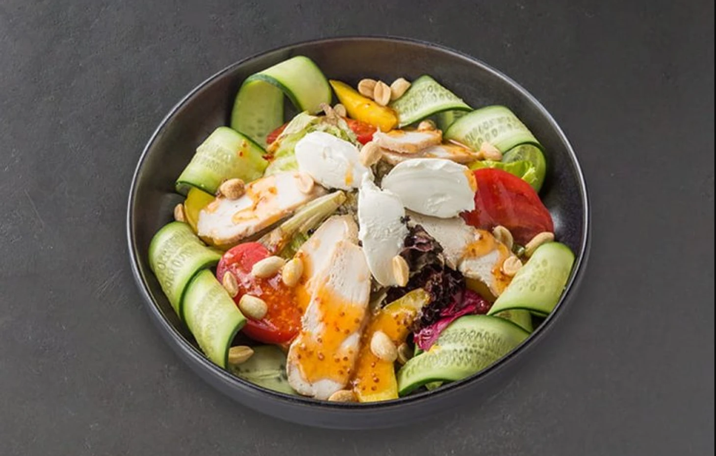 Курицу, овощи и фрукты необходимо смешать в одной чаше. Салат заправляется смесью оливкового масла и лимонного сока. Чтобы вкус был более пикантным, в заправку можно добавить ложку меда или зернистой горчицы.