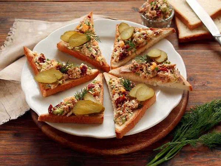 Смешайте тунца, огурец, зелень, майонез и горчицу.