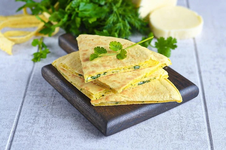 Переверните тортилью, посыпьте тёртым сыром и жарьте ещё 15 секунд.