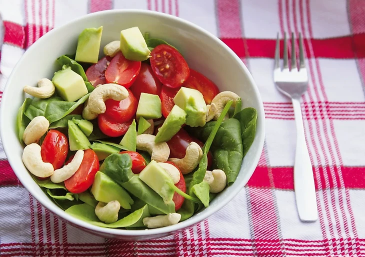 Проблем с приготовлением салата не возникнет. Помидоры, огурцы, салат и зелень необходимо произвольно нарезать. Овощи выкладываете в чашу, добавляете обжаренные орехи, соль и перец, а также подсолнечное или оливковое масло.