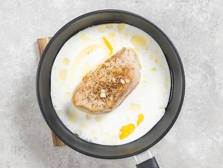 Запекайте свинину с молоком при 160°C 1 час под фольгой, затем снимите фольгу и запекайте ещё 30 минут.