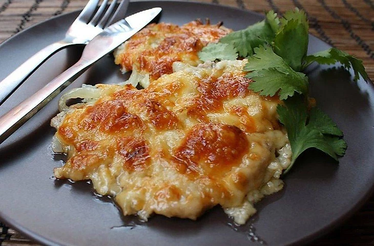 Выложите слоями свинину, лук, картофель, майонез, помидоры и сыр в смазанную маслом форму.
