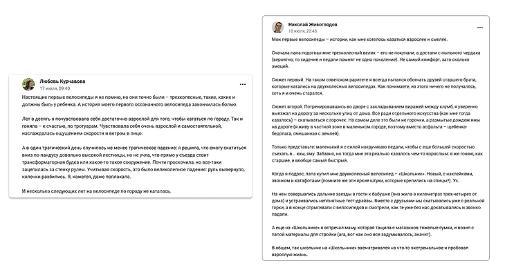 А в комментариях рассказать истории мы попросили вас. И эти воспоминания о первых велосипедах – в самое сердце: веселые, теплые, местами грустные и по-настоящему трогательные.