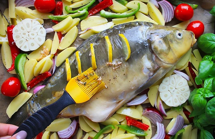 Фаршированный карп с овощами в духовке