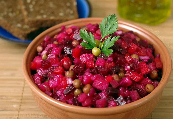 Винегрет отлично сочетается с кусочком ржаного хлеба.