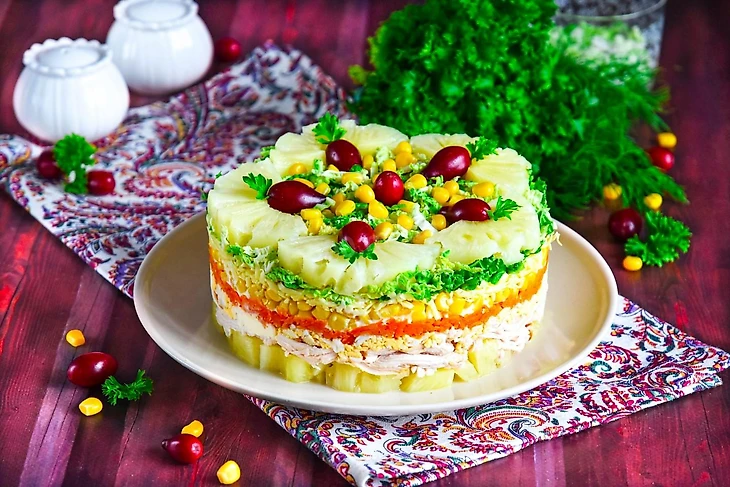 Салат «Ананас» с копчёной курицей: рецепт