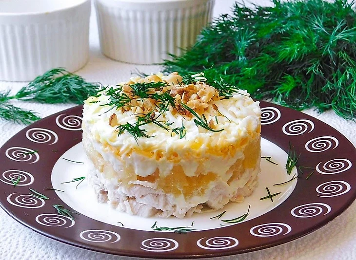 Этот салат порадует вас и ваших гостей своим необычным оформлением и вкусом. Сочетание копчёной курицы, сочных ананасов и нежного сыра давно стало классикой.