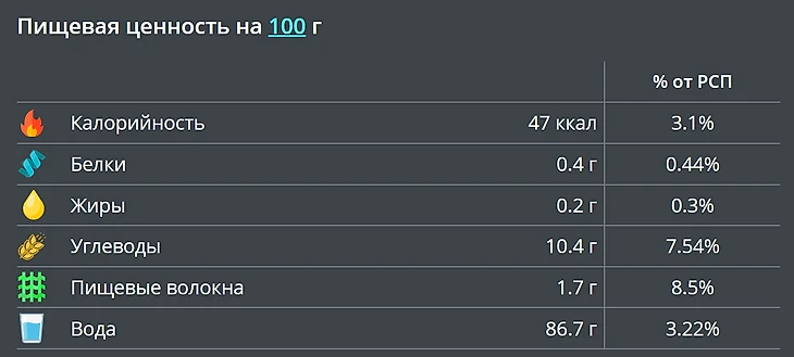 Продукт обладает низким гликемическим индексом, что делает ее подходящим фруктом для людей с диабетом или склонностью к повышению уровня сахара в крови. Также продукт может быть полезен при анемии благодаря содержанию железа.