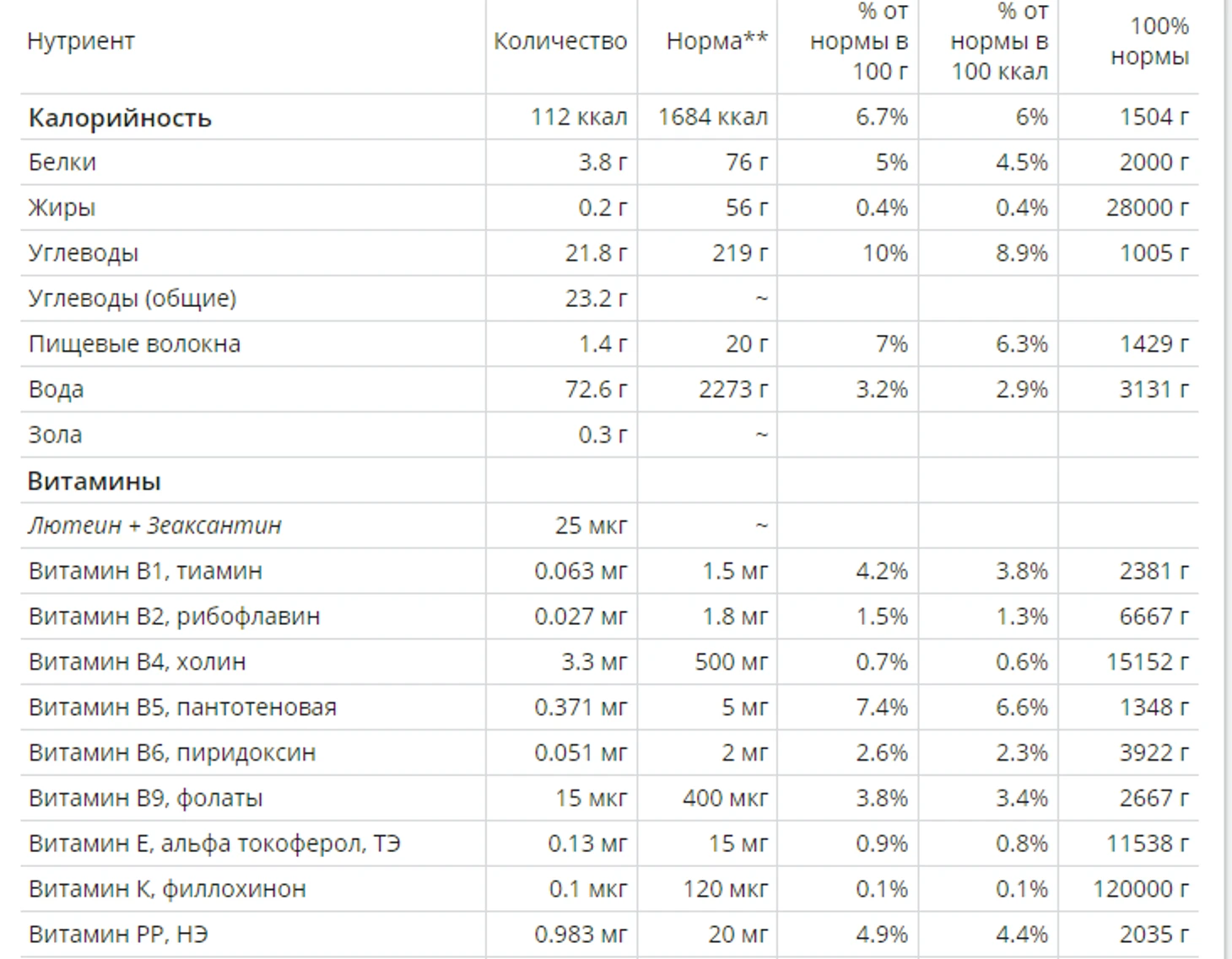 Крупу можно использовать как ценный источник сложных углеводов. В 100 граммах пропаренного всего 112 килокалорий, большая часть приходится на сложные углеводы, которых 23,2 грамма, белка в кускусе 3,79 грамма.