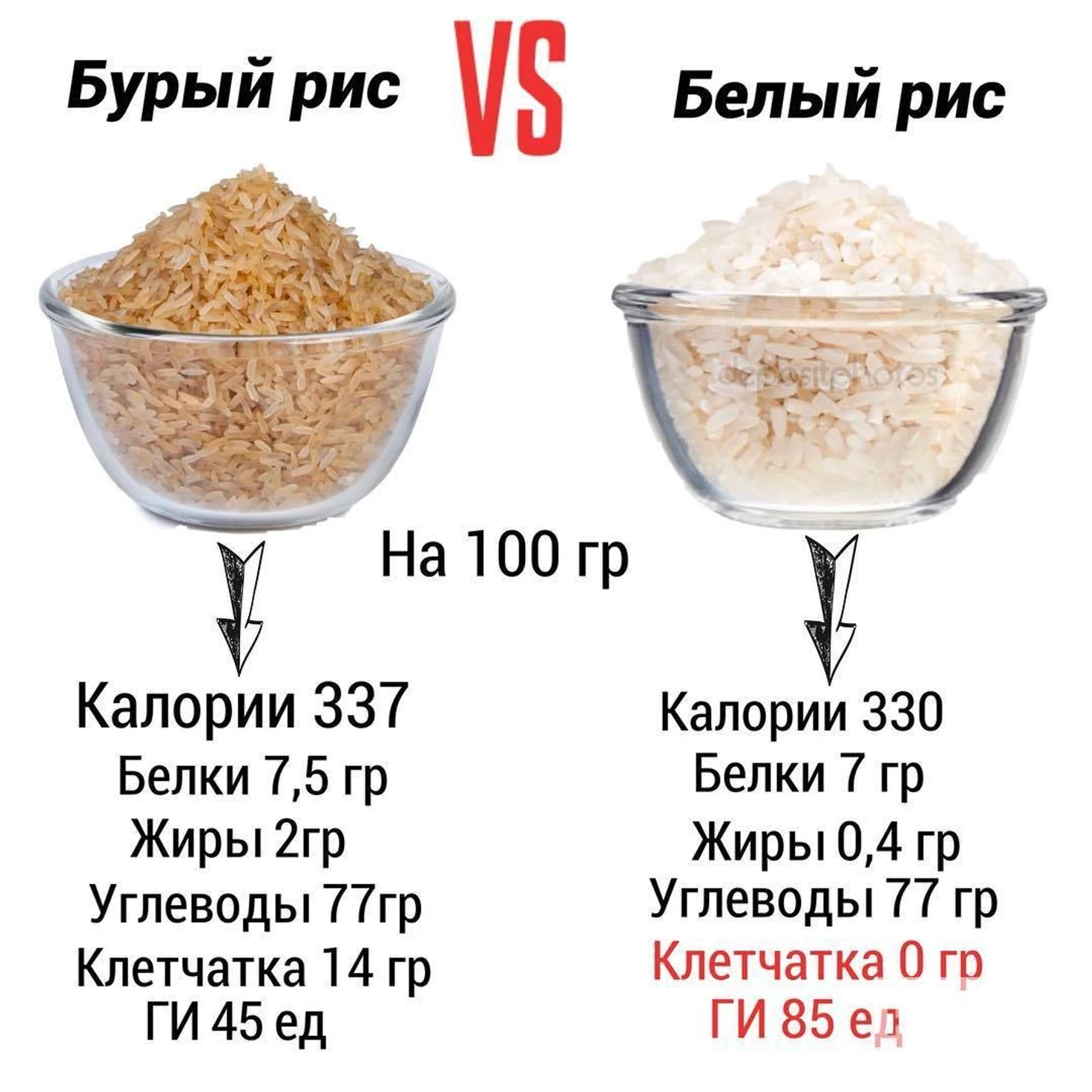 Множество разновидностей риса предполагает, что и его состав будет сильно отличаться. Наверняка многие наслышаны, что бурый или коричневый рис полезнее белого, причем немногие знают, что это один и тот же рис. Когда бурый рис подвергается обработке, мы как раз получаем хорошо всем знакомый белый рис. Оболочка удаляется, но в ней находится клетчатка, которая оказывает благотворное воздействие на желудочно-кишечный тракт. Перед вами состав белого и бурого риса.