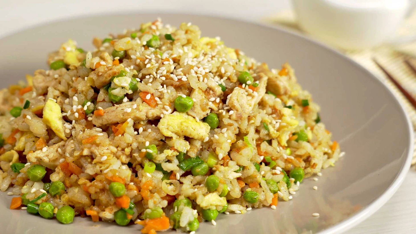 Сначала следует отварить рис. Пока рис варится, мелко нарезаем лук, имбирь, чеснок, морковь и зеленый лук. Далее берем куриное филе и также нарезаем мелкой соломкой. Разогреваем на плите сковороду и кладем в нее сливочное масло. Яйца взбиваем венчиком и выливаем в сковороду. Обжариваем их постоянно перемешивая. После обжарки выкладываем яйца в отдельную емкость. В ту же сковороду добавляем растительное масло и обжариваем на нем чеснок имбирь и лук, через минуту добавляем морковь, еще через минуту соевый соус и горошек. Все время перемешиваем массу. Теперь добавляем курицу, соль и перец, тушим все вместе еще три минуты. Кладем в сковороду яйца и следом отварной рис. Держим на огне еще около минуты, выкладываем готовое блюдо в большую тарелку и посыпаем сверху зеленым луком и семенами кунжута.