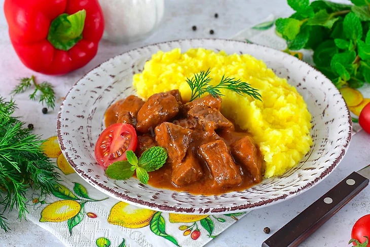 Гуляш из говядины с мягким картофельным пюре — это классическое блюдо, которое покорит своей простотой и вкусом. Мясо получается нежным, а подливка придаёт блюду насыщенный аромат.