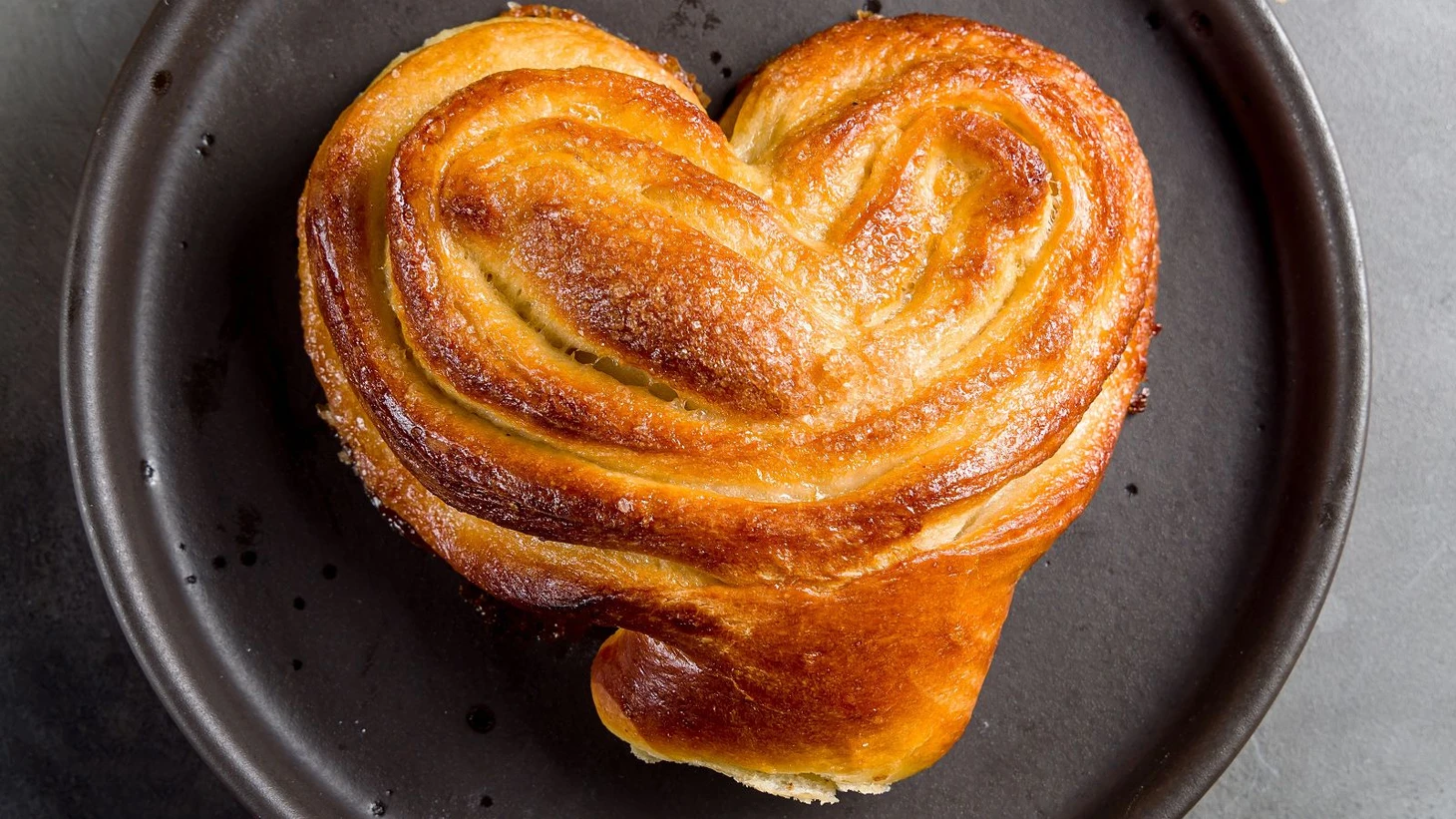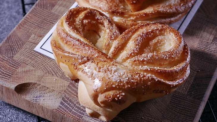 Раскатайте каждый колобок в овальную лепёшку, посыпьте сахаром, затем сверните в рулетик и сложите пополам. Сделайте надрез на сгибе и разверните его, чтобы получилась форма сердечка.