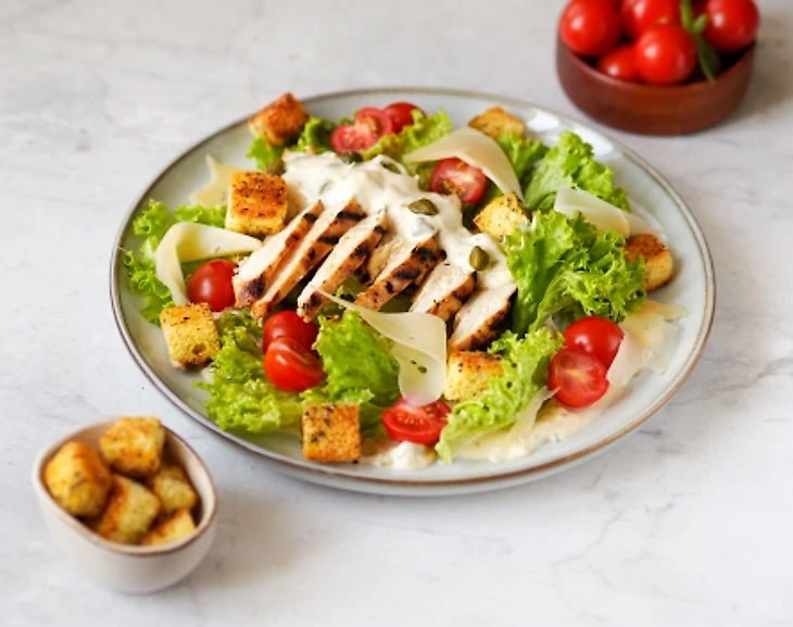 Этот упрощённый вариант знаменитого салата «Цезарь» сочетает в себе курицу, яйца, помидоры черри и обязательно хрустящие сухарики. Вместо классической заправки — оливковое масло с чесноком и лимонным соком. Лёгкий и сытный салат для любого случая.