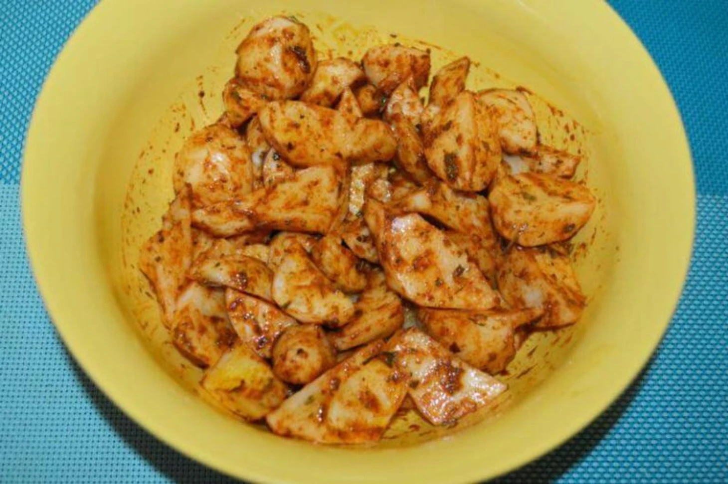 Для начала нужно разогреть духовку до 180 градусов. Чистим топинамбур и тщательно промываем плоды, затем нарезаем их на кубики вдоль и пополам. Складываем корнеплод в глубокую чашку, добавляем туда куркуму, паприку и прованские травы. Наливаем оливковое масло, солим и тщательно все перемешиваем руками. Каждая частичка топинамбура должна покрыться маслом и специями.